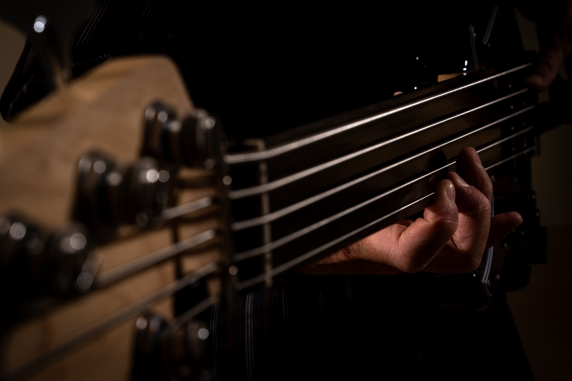 Egy hangulatot idéző fotó, amelyen egy basszusgitáros mély átéléssel játszik hangszerén. A kontrasztos fények és árnyékok kiemelik a pillanat intimitását és a zene bensőséges erejét.